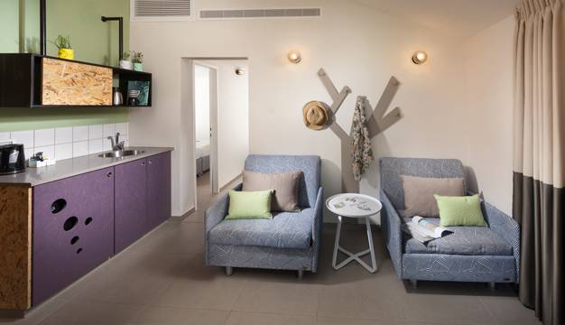חווית קמפינג בתנאי בית הארחה. מתחם אירוח משפחתי המחולק ל4 יחידות אירוח . היחידות ממוזגות, המיטות מוצעות, סבונים, שמפו ומגבות בכל יחידה. במתחם המשפחתי מטבחון ופרגולה משותפים. בישול במטבח אתר הקמפינג.