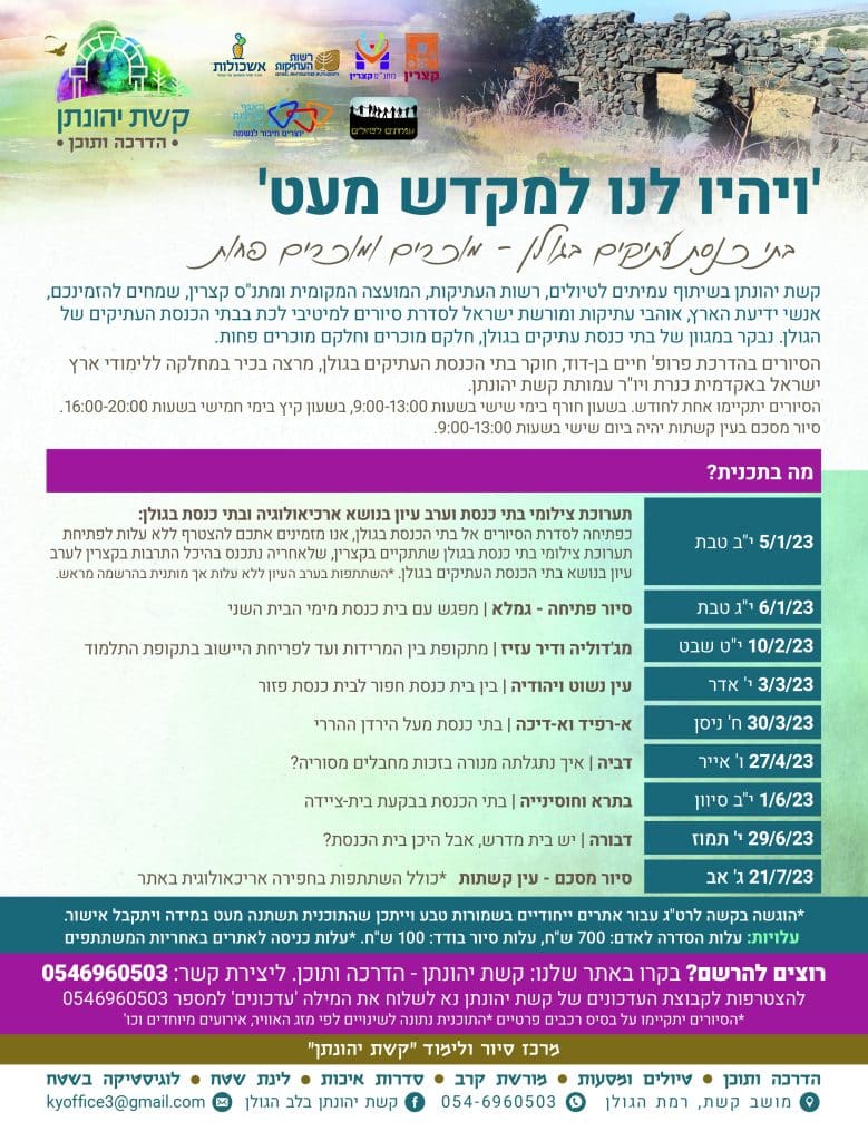 קשת יהונתן בשיתוף המועצה המקומית קצרין, רשות העתיקות ועמיתים לטיולים, מזמינים אתכם לטייל איתנו ולהגיע לאתרי בתי הכנסיות, אל הכפרים והחורבות בהם נמצאו הממצאים החשובים.